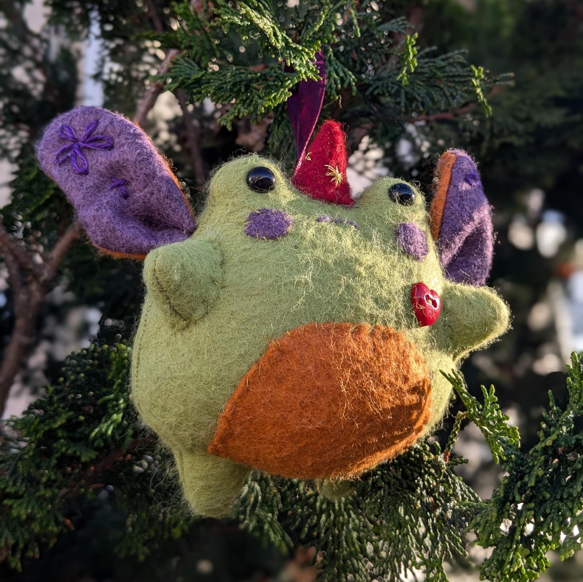 Fern is here to hop and flutter into your holiday season! Crafted from a durable merino wool blend felt, and firmly stuffed to cute perfection! She has lots of special details like a sturdy twill hanging loop, stars buttons on her back, and a little red fairy hat. She is the perfection addition to any Christmas tree!Â