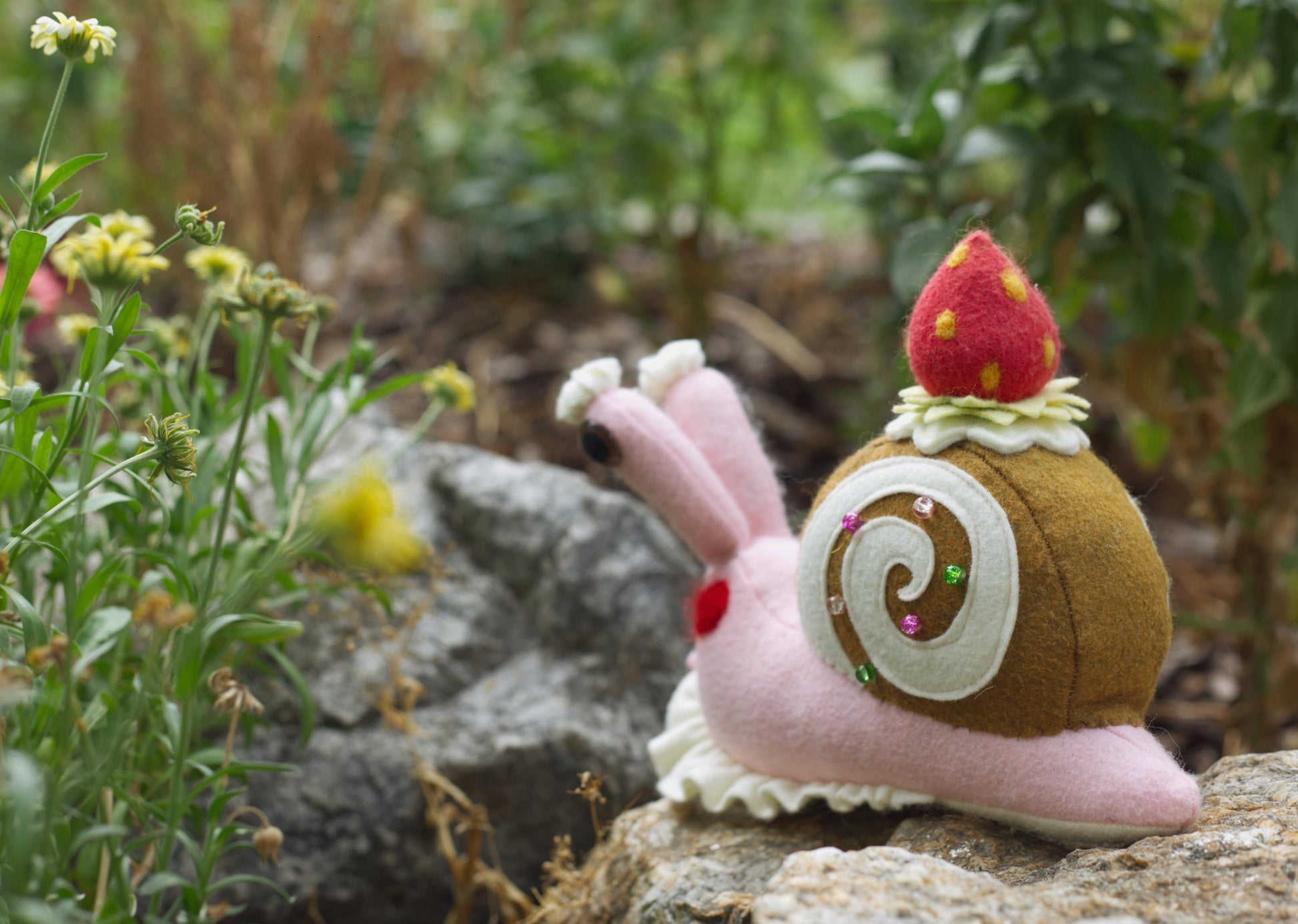 Madeline the snail is a one-of-a-kind creation from my workshop! Inspired by strawberry roll cakes and adorable pastries. ❤️🐌✨❤️ Measuring approximately 9.5" long, 8" tall, and 4" wide, Madeline is crafted from high-quality merino wool blend felt and is perfect for any adventure!