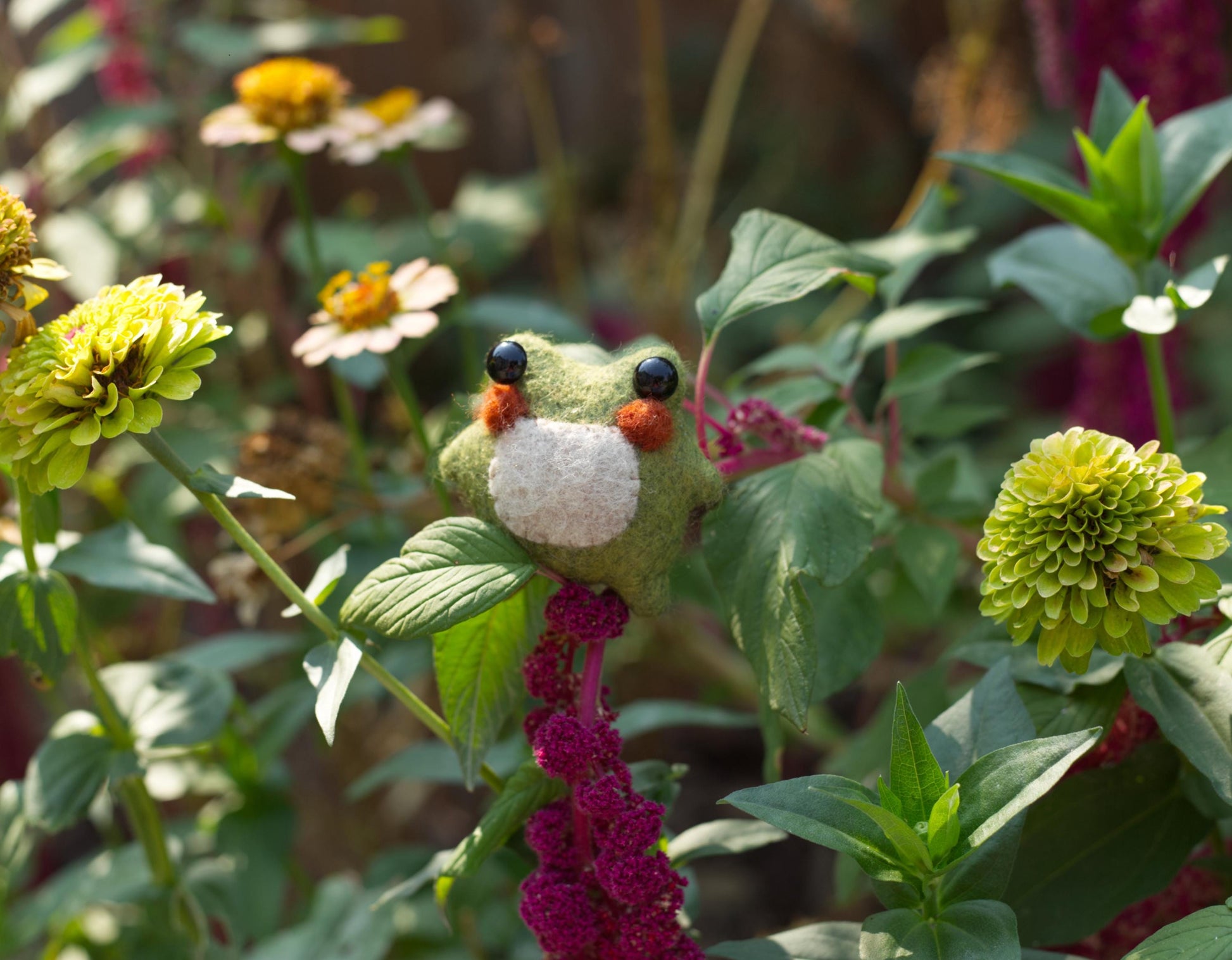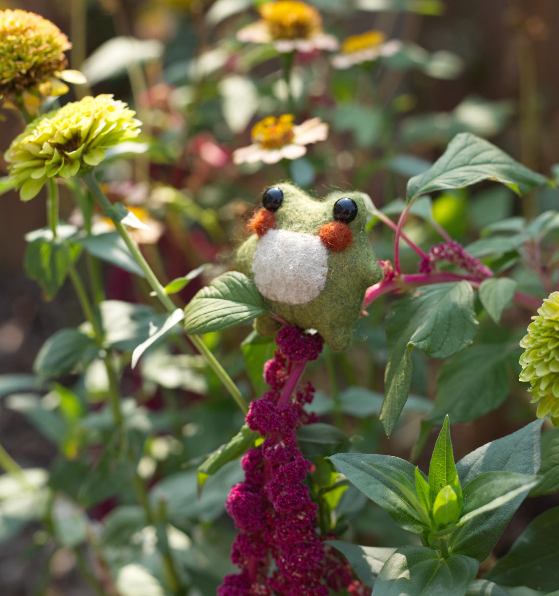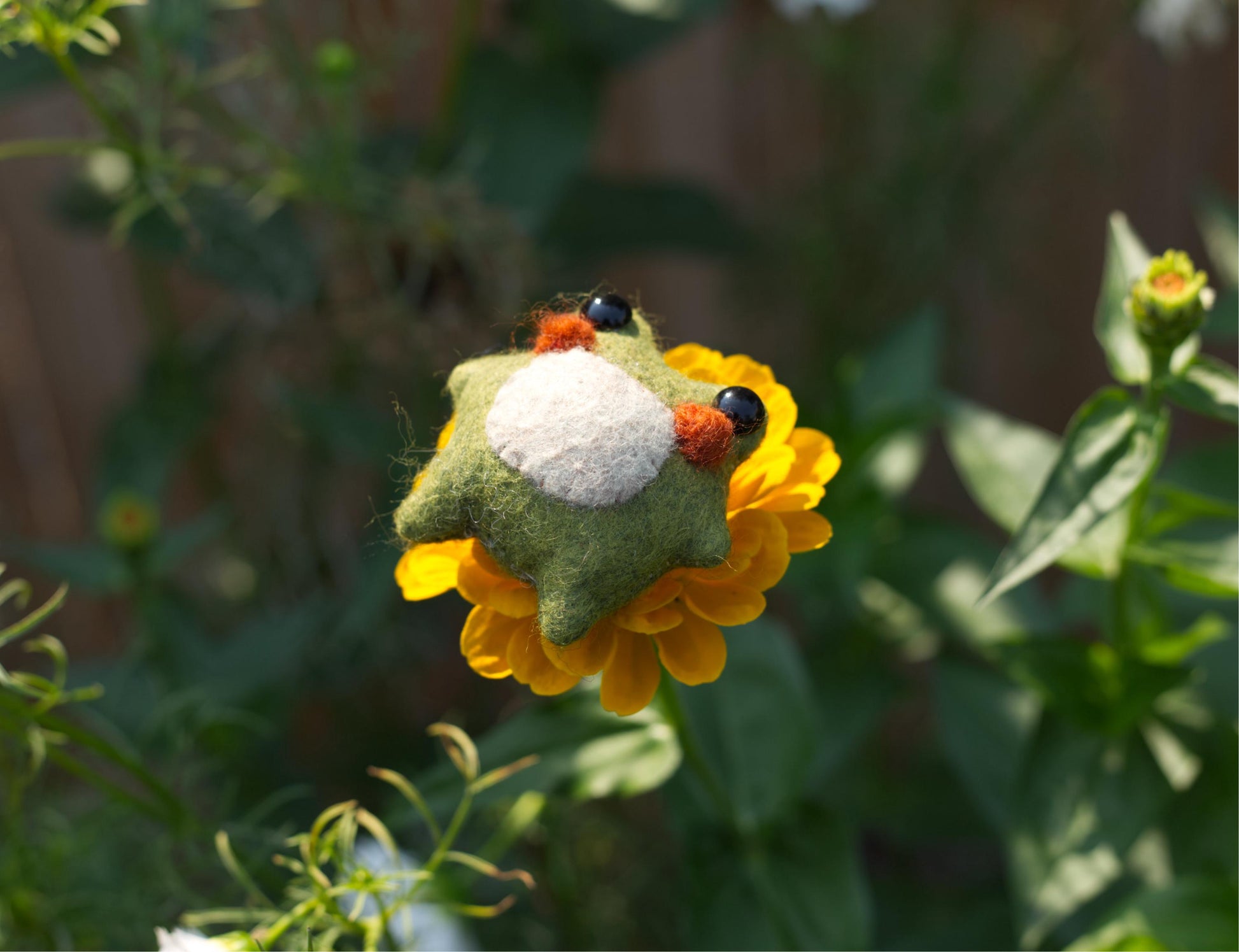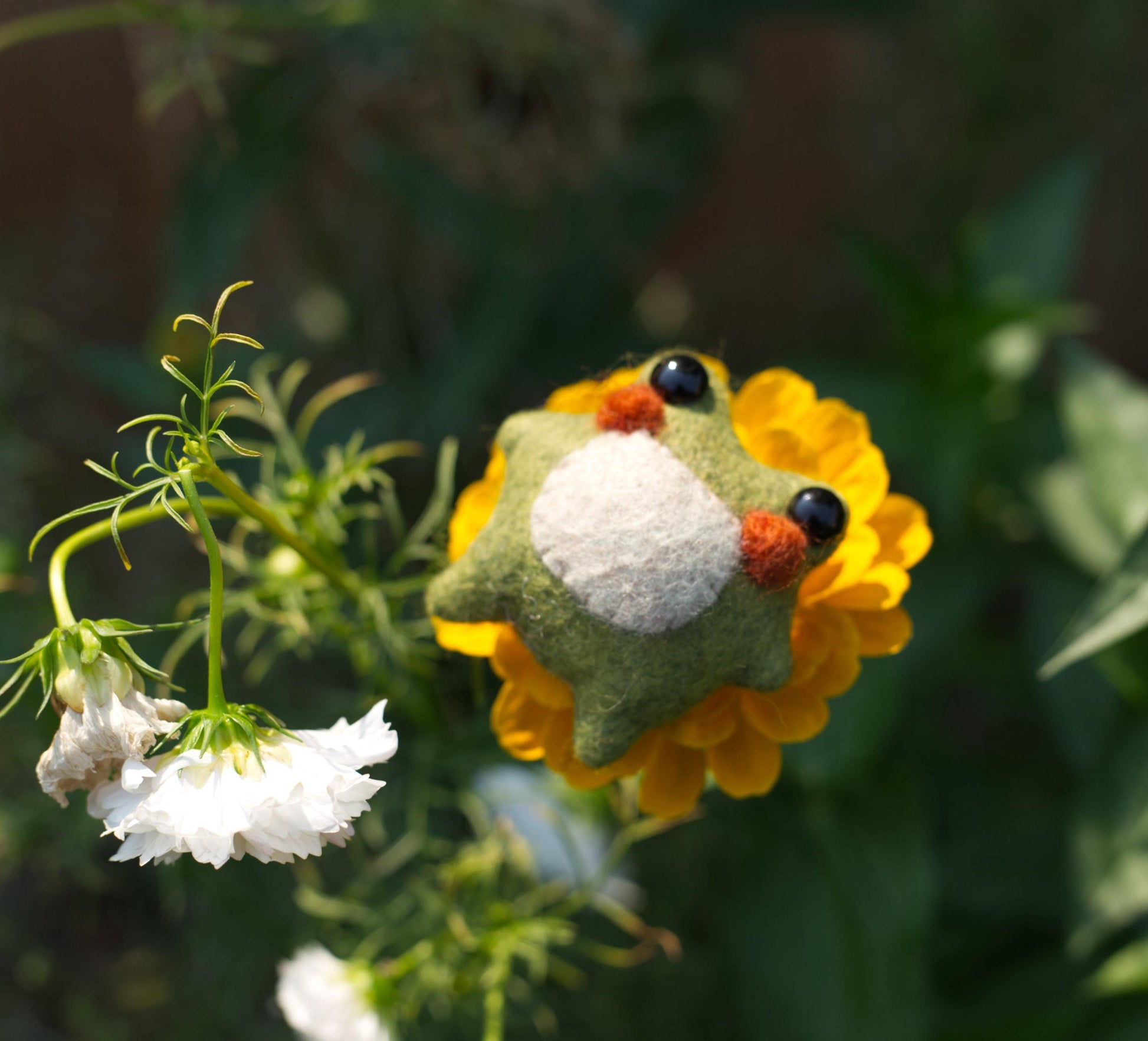 Merino wool blend felt, glass micro beads, safety eyes and poly-fill
